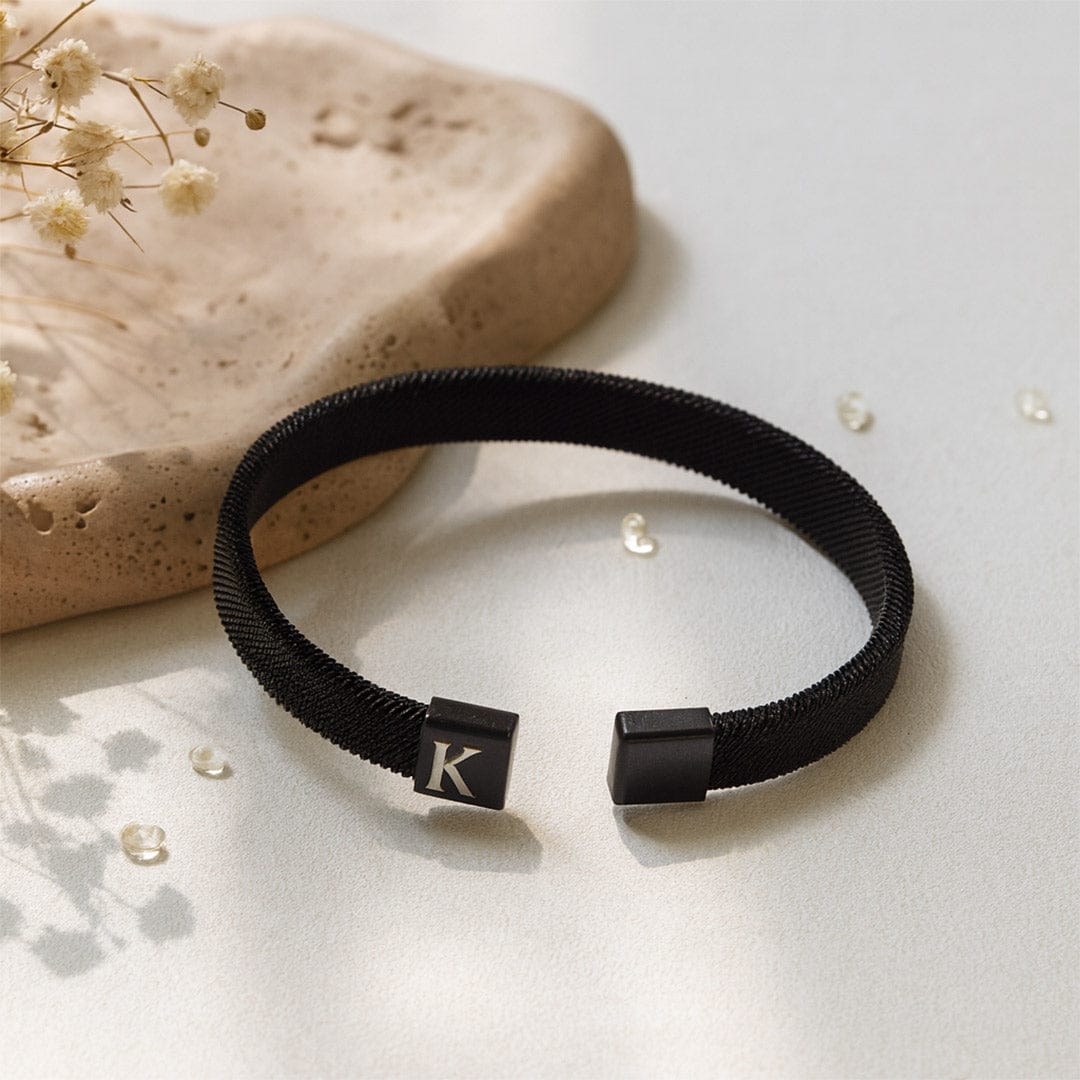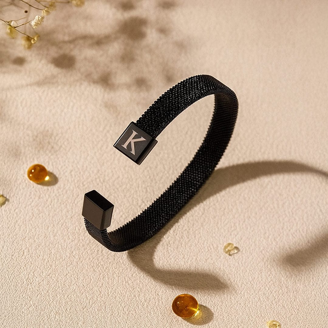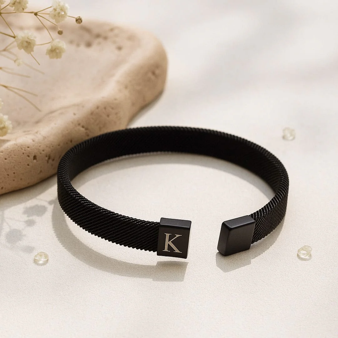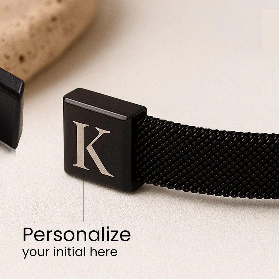 - Custom engraved initial on a solid matte black magnetic clasp